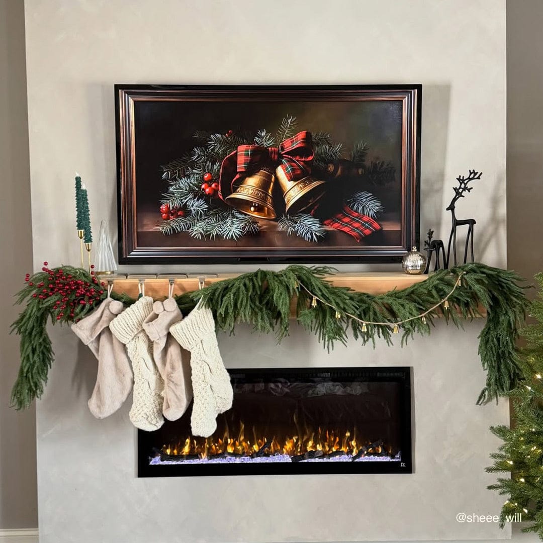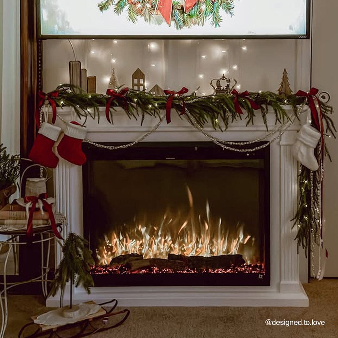 Touchstone Fireplug Pro Smart Electric Fireplace Insert in surround mantel decorated for the holidays. Photo credit: @thisgeorgiaclay
