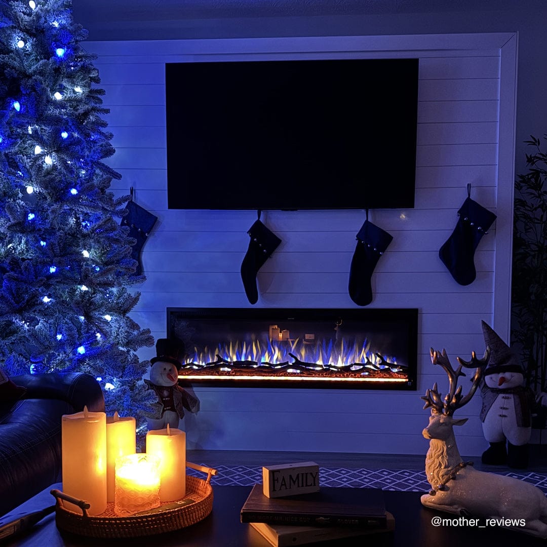 Touchstone Sideline Elite® Smart Electric Fireplace with holiday decor, photo credit @bohoglamhaus Touchstone Sideline Elite Smart Electric Fireplace with holiday decor, photo credit @bohoglamhaus