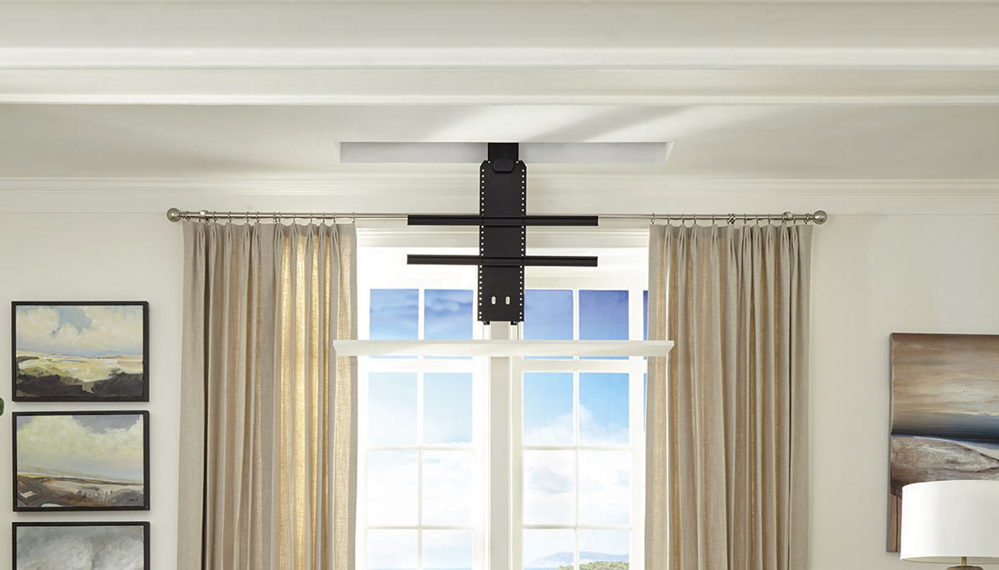Turn any space into a home theatre, lowering the TV into view from the ceiling, cabinet or faux wall.