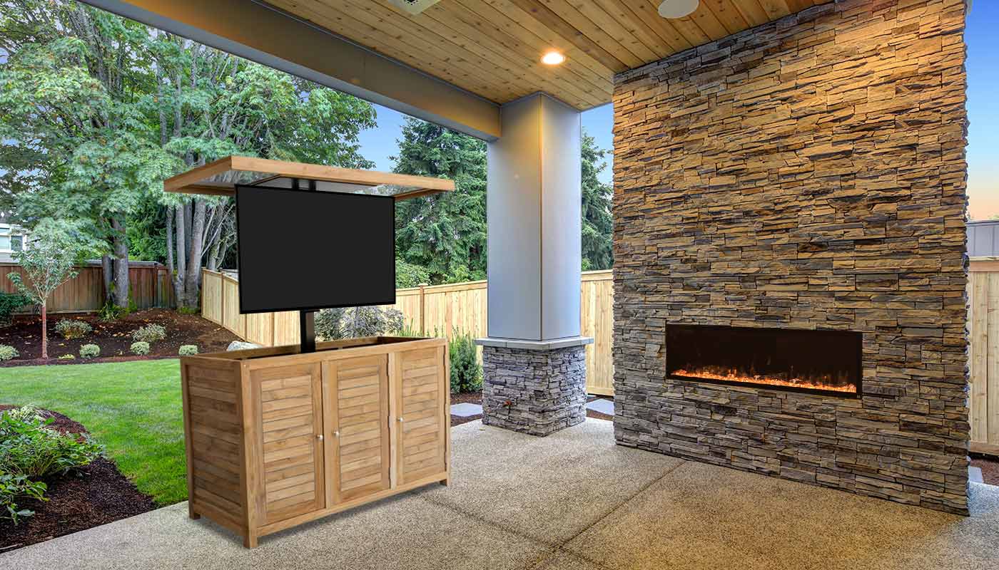 Electric fireplaces and weatherproof TV lift cabinets, specially made for outdoor use.